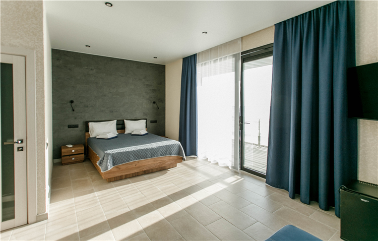 Номер комфорт двухместный с собственным балконом и видом на море. В номере: двуспальная кровать или две односпальные кровати, дополнительное место диван,кондиционер, телевизор, холодильник, шкаф, стол и стул, халаты, фен, гигиенические принадлежности.