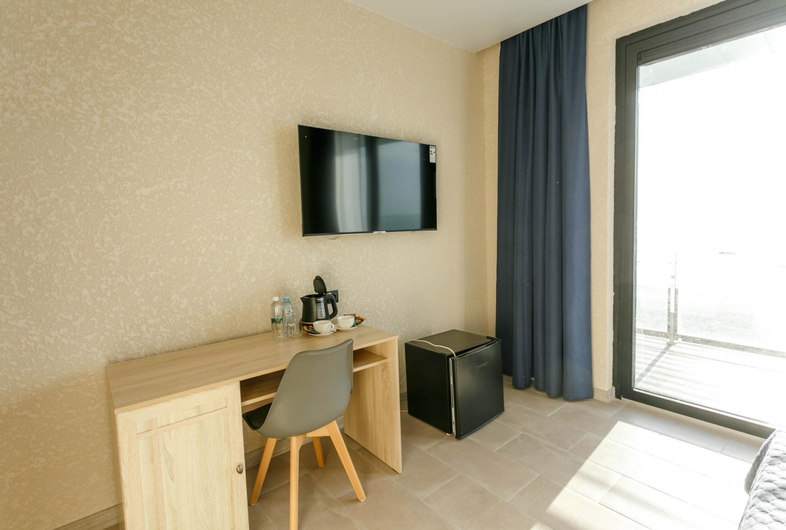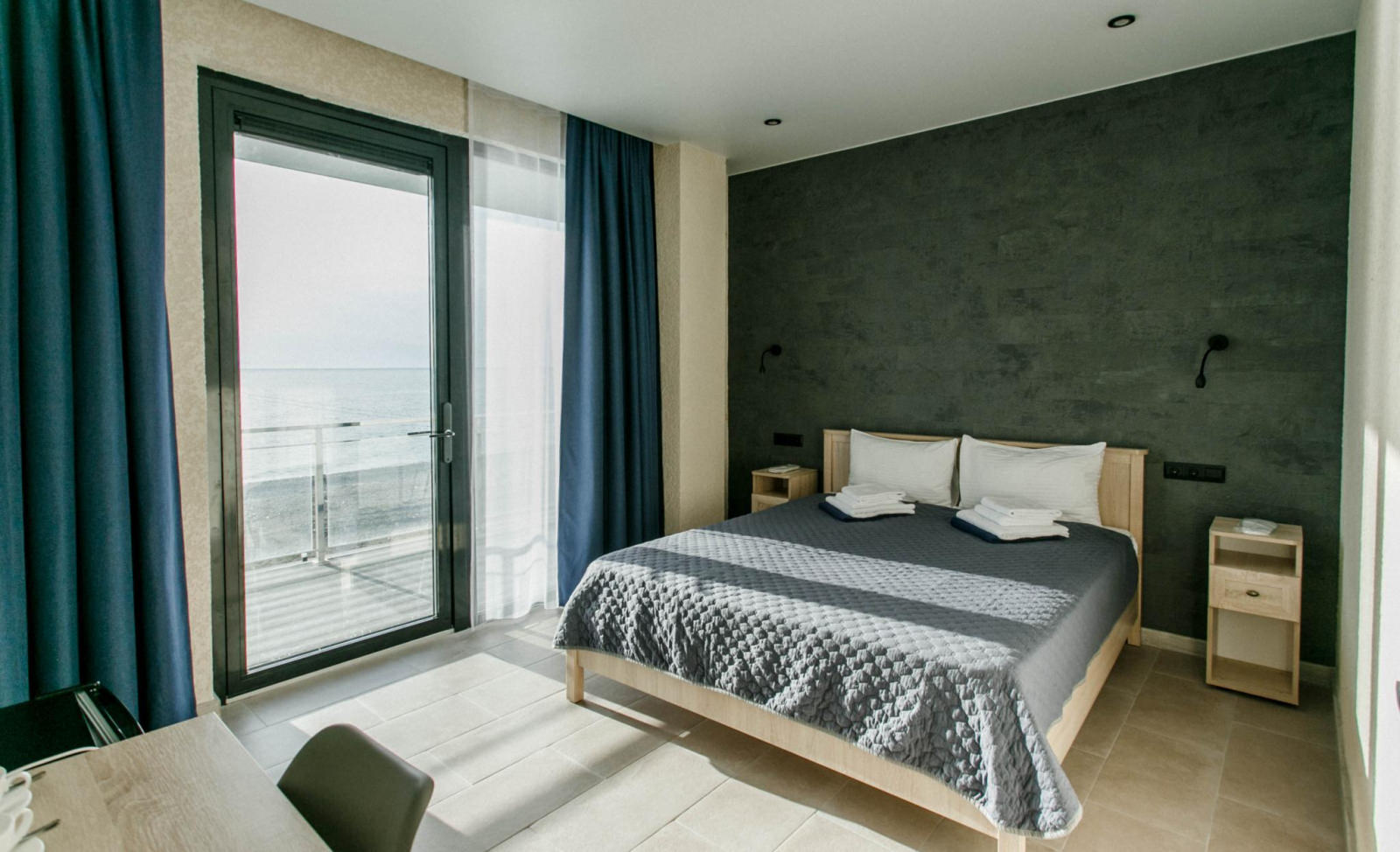 Стандартный двухместный номер с общим балконом и видом на море. В номере: двуспальная кровать или две односпальные кровати, дополнительное место диван, кондиционер, телевизор, холодильник, шкаф, стол и стул, халаты, фен, гигиенические принадлежности. Номера располагаются на первом (с общей террасой) и втором (с общим балконом) этажах.
